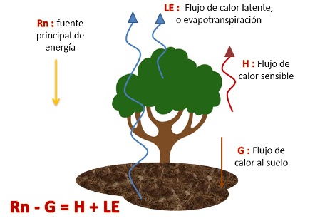Actualmente existe la tecnología para medir directamente los componentes del balance de energía (Fig. 1), así como para guardar y analizar una gran cantidad de datos, de todos los componentes del balance de energía a nivel local (es decir, a escala espacial típica de parcelas cultivadas: cientos de metros). Esta tecnología incluye radiómetros con los que se puede medir los cuatro componentes del balance de radiación, placas que se entierran en el suelo para medir el flujo de calor en el suelo, así como la instrumentación especializada para determinar cambios en alta frecuencia (por ejemplo, 20 veces por segundo) de la temperatura y humedad del aire (Alvarado 2017). A pesar de esto, la instrumentación requerida para mediciones directas es muy cara, lo que limita su uso generalizado. Así que una alternativa es realizar estos estudios utilizando modelación matemática, basada en la física de los procesos involucrados, para estimar los componentes del balance de energía. Como entrada al modelo, se pueden utilizar observaciones indirectas como las que provienen de sensores instalados en satélites, aviones o drones, en combinación con datos más típicamente disponibles como los que provienen de estaciones meteorológicas. Algunos sensores instalados en los vehículos de observación remota pueden medir la emisividad de la superficie, la proporción de la radiación solar incidente que es reflejada por la superficie, o albedo, y la temperatura de la superficie. Con éstas, y ecuaciones que describen el transporte de calor y humedad en la atmósfera, se puede determinar todos los componentes del balance de energía de la superficie (Petropoulos, 2017).